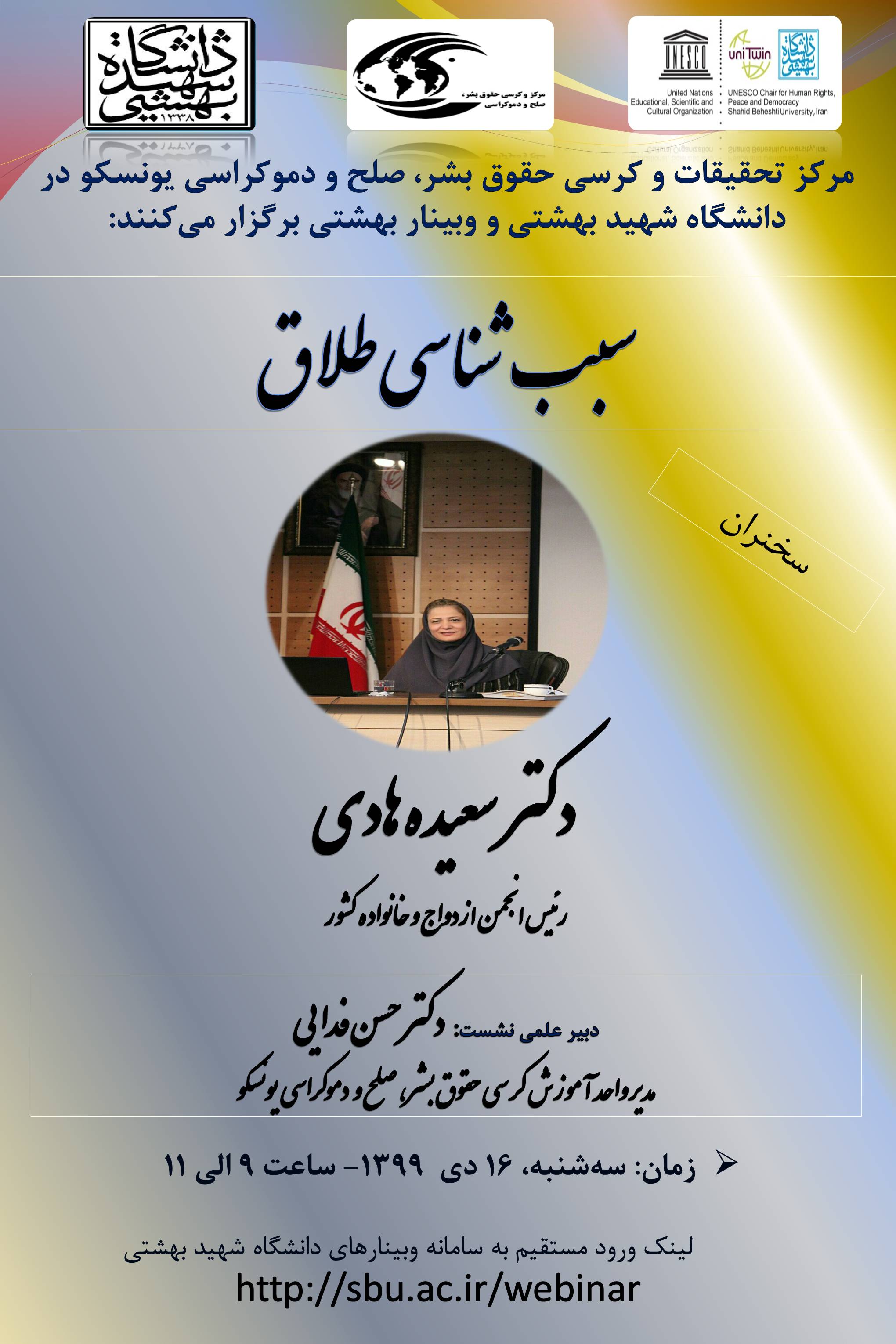 برگزاری وبینار سبب شناسی طلاق 9657 بازدید print share 16 دی به اطلاع دانشجویان، پژوهشگران و علاقمندان محترم می رساند مرکز تحقیقات و کرسی حقوق بشر، صلح و دموکراسی یونسکو در دانشگاه شهید بهشتی با...